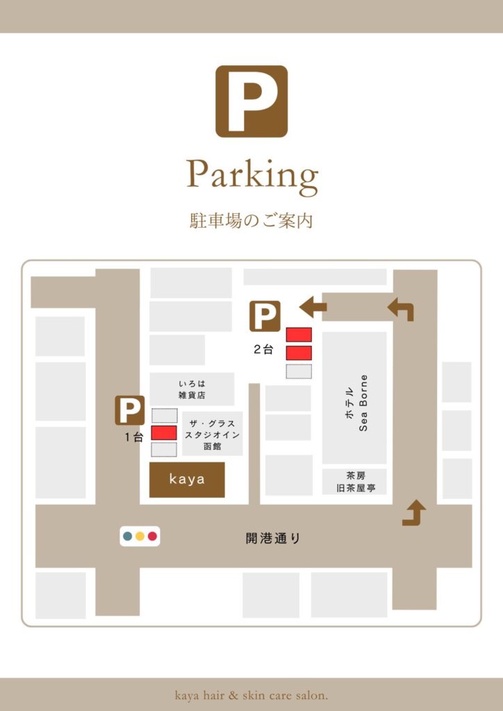 お車でお越しのお客様は、こちらの駐車場をご利用いただけます。※場所については画像ご参照ください。 ・グラススタジオ様 駐車場・ホテルシーボン様 駐車場 皆さまのご来店を心よりお待ちしております🕊️